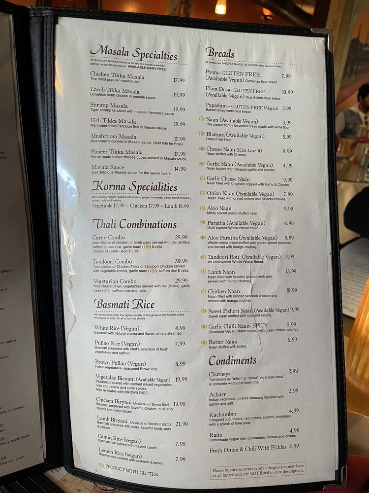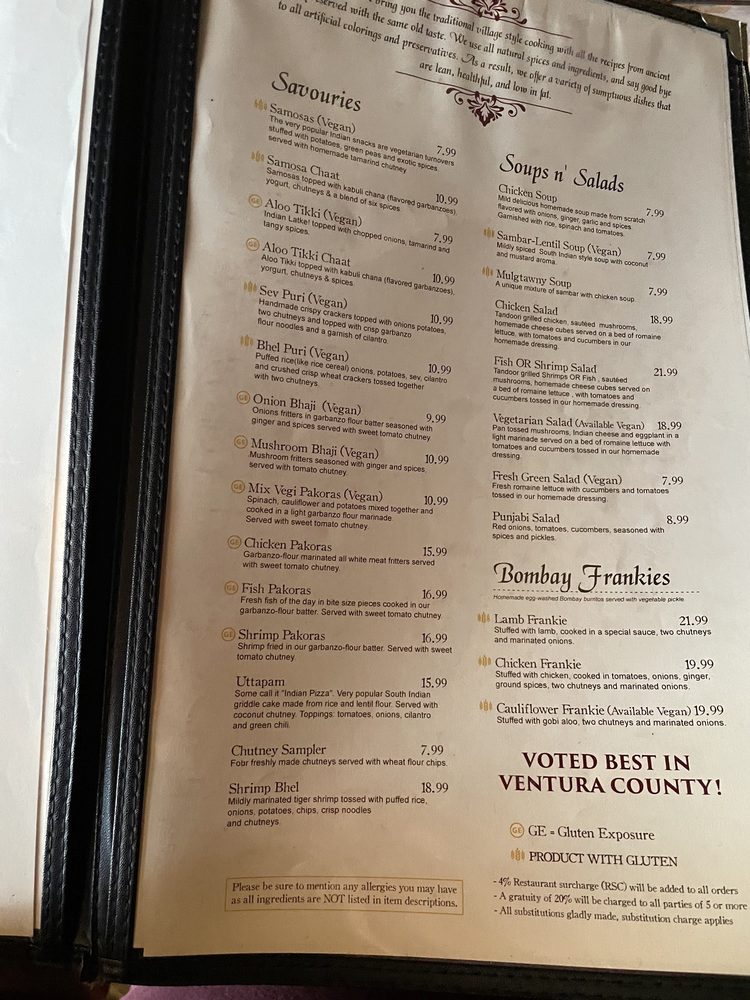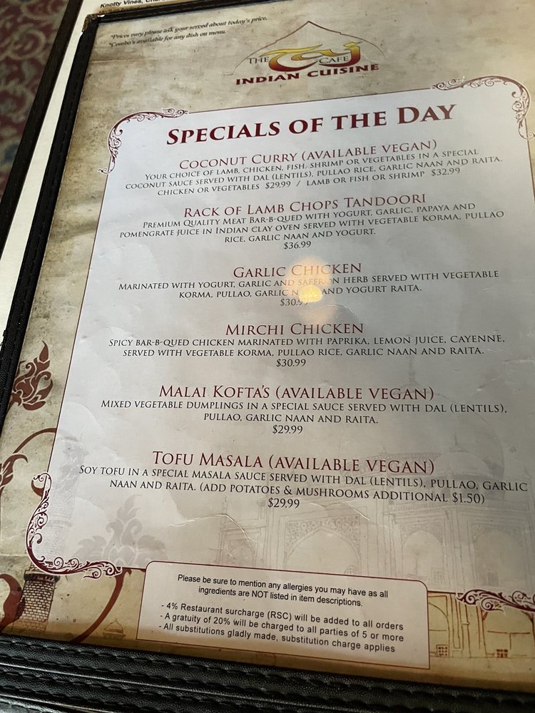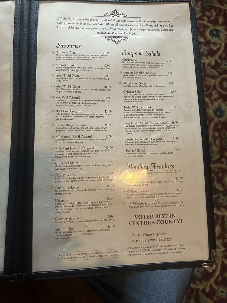 The Taj Cafe in Ventura, CA offers a diverse menu of Indian cuisine with vegan and gluten-free options. From savory samosas and aloo tikki to flavorful lamb and chicken frankies, each dish is packed with exotic spices and authentic flavors. Customers rave about the cozy ambiance, prompt service, and generous portions that make dining here a delightful experience. Must-try dishes include the malai kofta, aloo saag, and vindaloo with spicy garlic naan. The cardamom rice pudding dessert is a sweet ending to a satisfying meal. Whether dining in or enjoying takeout, The Taj Cafe promises a memorable culinary journey through traditional Indian dishes. Make sure to pair your meal with a refreshing ginger lemonade or a selection from their beer and wine options. The Taj Cafe is not just a place to eat; it's an immersive dining experience that will leave you craving more.